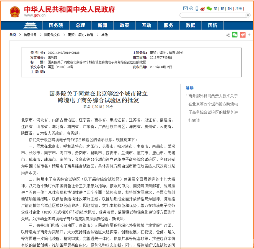 中國國務院8月7日前發(fā)布公告,同意在北京等22個城市增設跨境電子商務綜合試驗區(qū),由此,中國跨境電子商務綜合試驗區(qū)總數(shù)達35個。