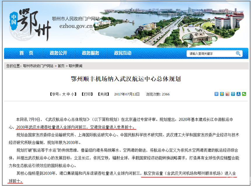 2017年7月12日鄂州政府網(wǎng)發(fā)布消息稱,7月9日,《武漢航運中心總體規(guī)劃》在北京通過專家評審。規(guī)劃提出:2020年基本建成長江中游航運中心,2030年武漢水港吞吐量進入全球內(nèi)河前三,空港貨運量(含武漢天河機場和鄂州順豐機場)進入世界前十。