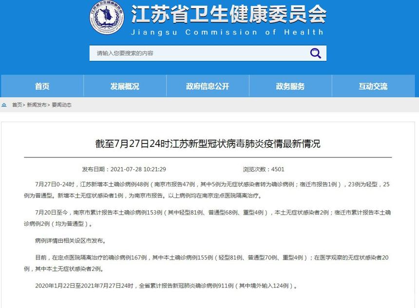根據江蘇衛生健康委會7月28日發布的消息,7月20日至7月27日,南京增加新冠肺炎本土病例153人,本土無癥狀感染者2例;宿遷市累計報告本土確診病例2例。