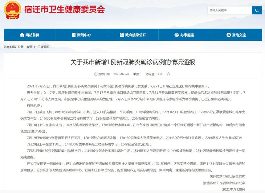 而宿遷確診兩人位母女關系,7月17日從南京祿口機場返回宿遷市泗陽縣,母女兩人7月22日、7月27日相繼確診。