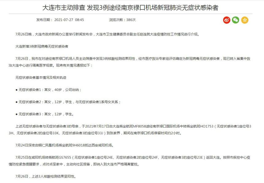 7月27日,大連衛生健康委員會發布消息稱,大連市主動排查,發現3例途經南京祿口機場新冠肺炎無癥狀感染者。 感染人員2021年7月17日由大連乘坐廈門航空MF8058航班途經南京祿口國際機場中轉乘坐吉祥航空HO1753航班到張家界,期間在南京祿口機場停留時間約2小時。7月24日深夜由銅仁鳳凰機場乘坐長安航空9H6018航班抵達西安咸陽機場,7月25日在咸陽機場轉乘天津航空GS7655航班返回大連。
