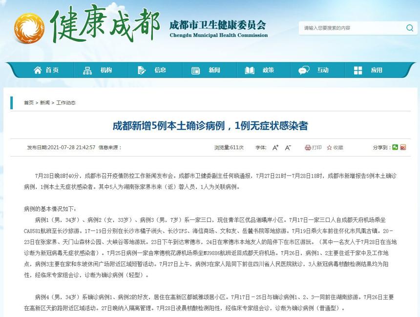 7月28日晚間四川成市召開疫情防控工作新聞發布會。成都市衛健委副主任何曉通報,7月27日21時—7月28日18時,成都市新增報告5例本土確診病例,1例本土無癥狀感染者。其中5人為湖南張家界市來(返)蓉人員,1人為關聯病例。