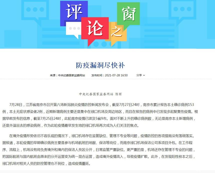 關于本次疫情,中紀委官網7月28日發布評論文章《防疫漏洞盡快補》。文章稱,南京祿口機場存在監管缺位、管理不專業等問題,疫情防控的各項措施沒有落細落實。據報道,本輪疫情的早期確診病例主要是參與機場航班的地服、保潔等崗位,而南京祿口機場保潔公司系項目外包。在工作程序、流程上,機場沒有將負責境外和境內的保潔人員區分開,日常監管嚴重缺位。更嚴重的是,機場還存在管理不專業的問題,把國際航班與國內航班由原來的分開運營變為統一混合運營,造成境外疫情流入,導致疫情擴散。此外,在發現陽性樣本之后,祿口機場對相關人員的防控管理也不到位,造成疫情蔓延。