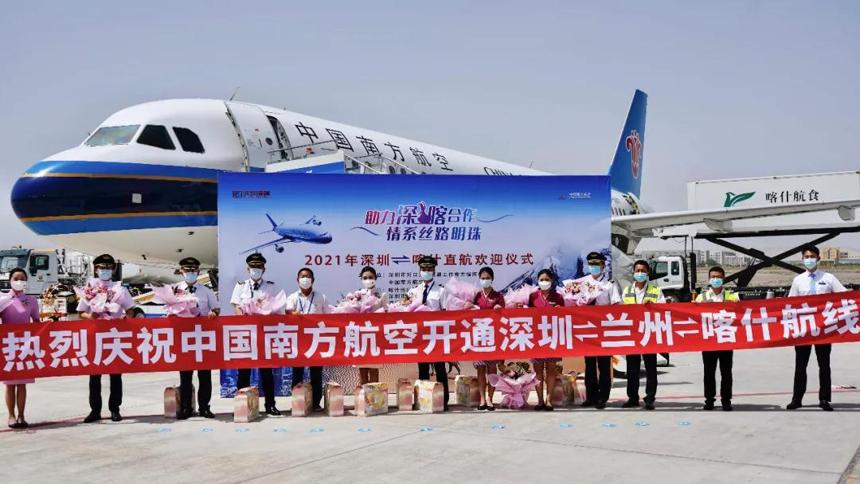 7月29日15:42,隨著南航CZ8691航班平穩降落在喀什機場,標志著南航正式開通深圳-蘭州-喀什航線。