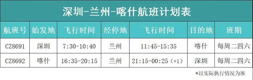 據南航深圳分公司消息,深圳-蘭州-喀什航線航班號為CZ8691,每周逢二、四、六,往返各一班。CZ8691計劃上午7:30起飛,經停蘭州,15:35到達喀什 ;返程CZ8692航班,計劃16:35從喀什起飛,經停蘭州,次日00:25到達深圳。