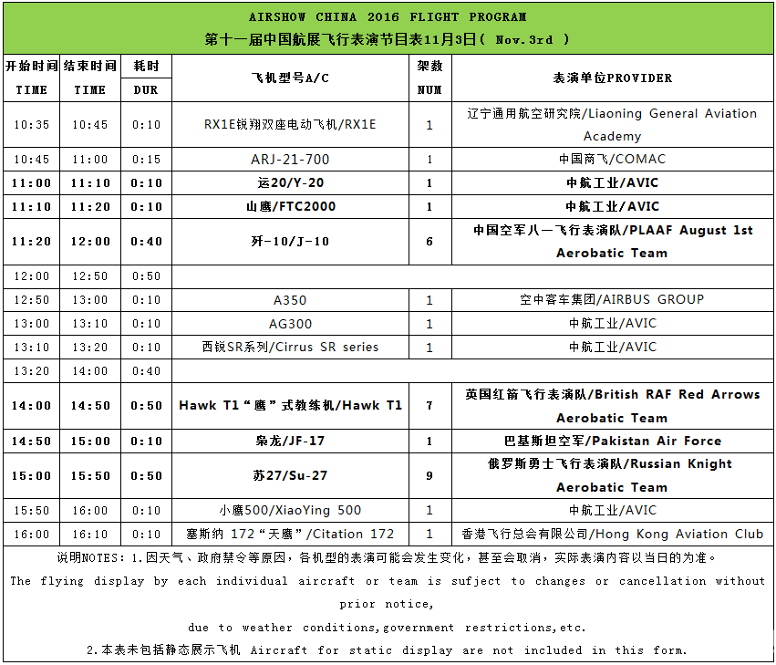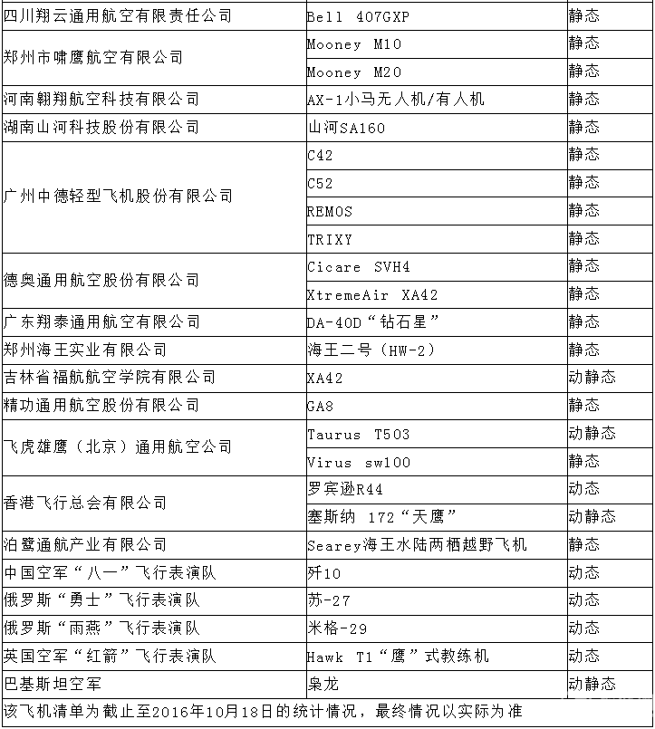 2016中國國際航展135架飛機參展 飛行表演節目表出爐