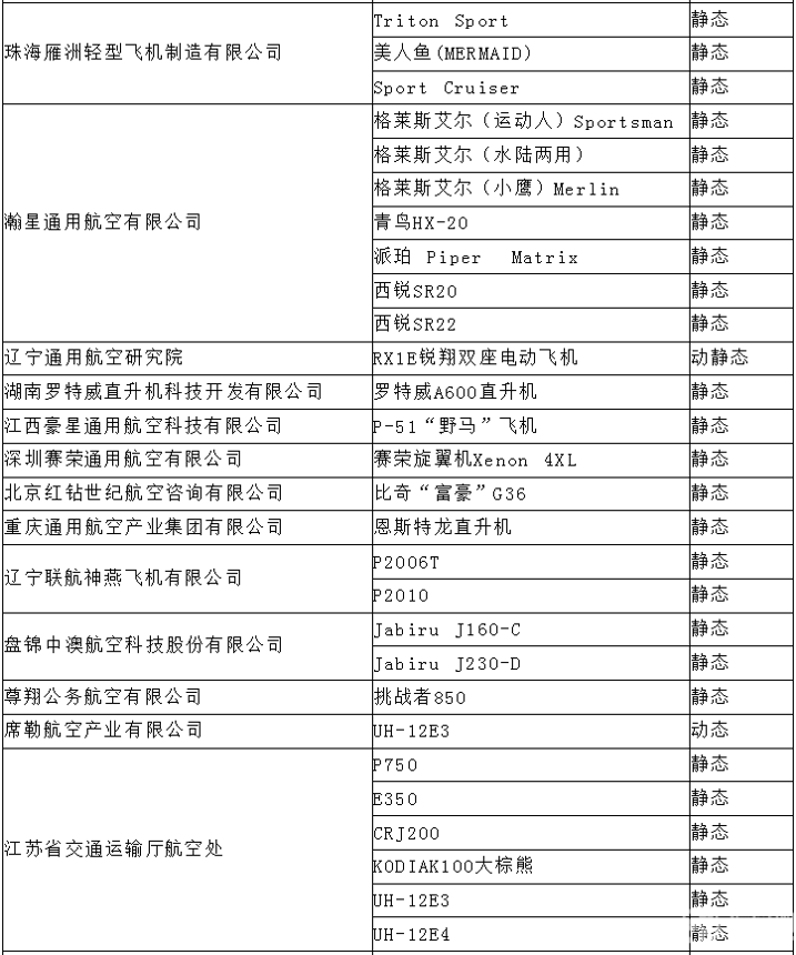 中國航展官方網站已經公布了參展飛機情況,包括中國人民解放軍空軍殲10表演機、殲10B、轟6K、運9等、中航工業運20、中國商飛ARJ-21-700(中國首款國產噴氣式支線客機),以及波音787—9、空中客車A350、俄羅斯蘇霍伊SSJ-100等明星機型。