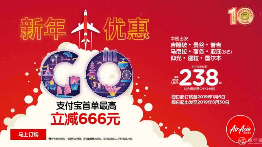亞洲航空新年優惠促銷即日上線, 本次推出的新年優惠預訂日期從即日起至2019年1月6日,出發日期從即日起至2019年6月30日。從中國出發的航線單程全包會員價低至人民幣238元