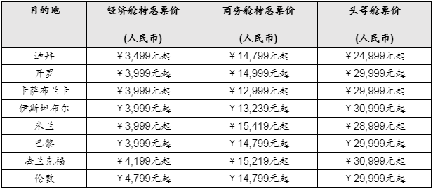指定時(shí)間段內(nèi),搭乘阿聯(lián)酋航空從北京、上海和廣州出發(fā)、前往阿聯(lián)酋航空全球精選目的地的乘客,可享商務(wù)艙和經(jīng)濟(jì)艙特惠機(jī)票。