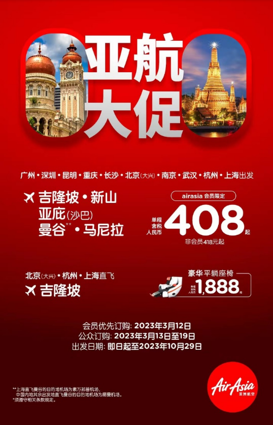 擁有最大機隊和最廣闊飛行網絡的低成本航空公司亞洲航空3月12日宣布本季度大促開售。中國國內出發直飛和東南亞各國境內及國際航線均參與活動,部分航線零元