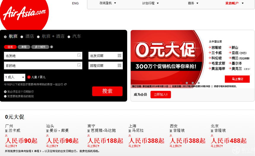零元(?未包含稅費的單程票價)大促機票預訂時間為2016年9月5日至9月11日。出行日期從2017年2月6日至同年10月28日。旅客可以從亞洲航空官網www.airasia.com或者官方手機應用預訂。中國出發的零元航線包括廣州-蘭卡威、香港-吉隆坡、潮汕-曼谷、澳門-曼谷航線。時間段涵蓋五一小長假和學生暑假。