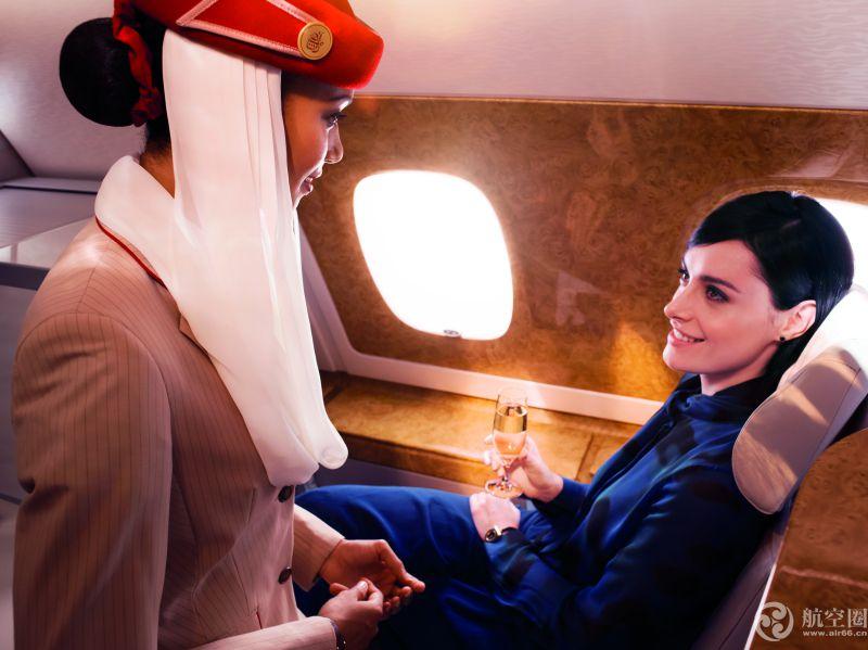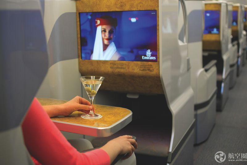 在阿聯酋航空的航班上,商務艙乘客可享用到具有當地風味的定制菜品,以及免費贈送的香檳和頂級烈酒。除沙特航線外,阿聯酋航空提供各式獨家的紅葡萄酒、白葡萄酒和波特酒,酒單依據航線而定。在阿聯酋航空所有A380機型上,在上層商務艙的后方,配有頭等艙和商務艙乘客專屬的機上行政酒廊,為乘客提供了一個輕松愜意的環境去享受上等好酒和美味點心。此外,阿聯酋航空連續12年蟬聯 “全球最佳機上娛樂”大獎的ice(信息、通訊、娛樂)數碼寬屏娛樂系統提供超過2,500個點播頻道。不僅如此,在大部分航班上,乘客還可使用機上Wi-Fi服務, 10MB免費流量用完后,只需以1美元即可購買500MB流量。