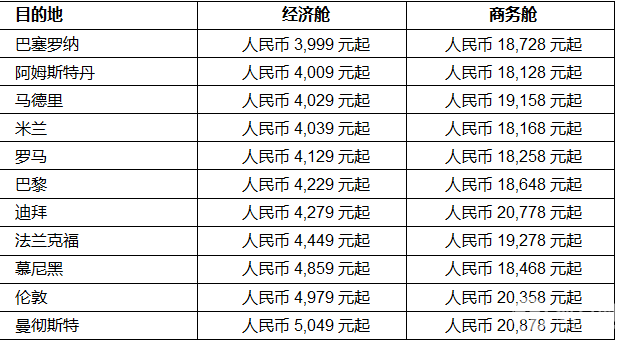 從北京、上海、鄭州或銀川出發(fā),前往11個(gè)歐洲和中東地區(qū)指定目的地的中國(guó)乘客,可以享受經(jīng)濟(jì)艙3,999元人民幣起,商務(wù)艙18,128元人民幣起的超值特惠。具體價(jià)格依目的地而定。所有票價(jià)均為往返票價(jià),且包含稅費(fèi)和燃油費(fèi)。想要在2016年冬季和2017年春季體驗(yàn)海外風(fēng)情的乘客,千萬不要錯(cuò)過這次難得的機(jī)會(huì)。