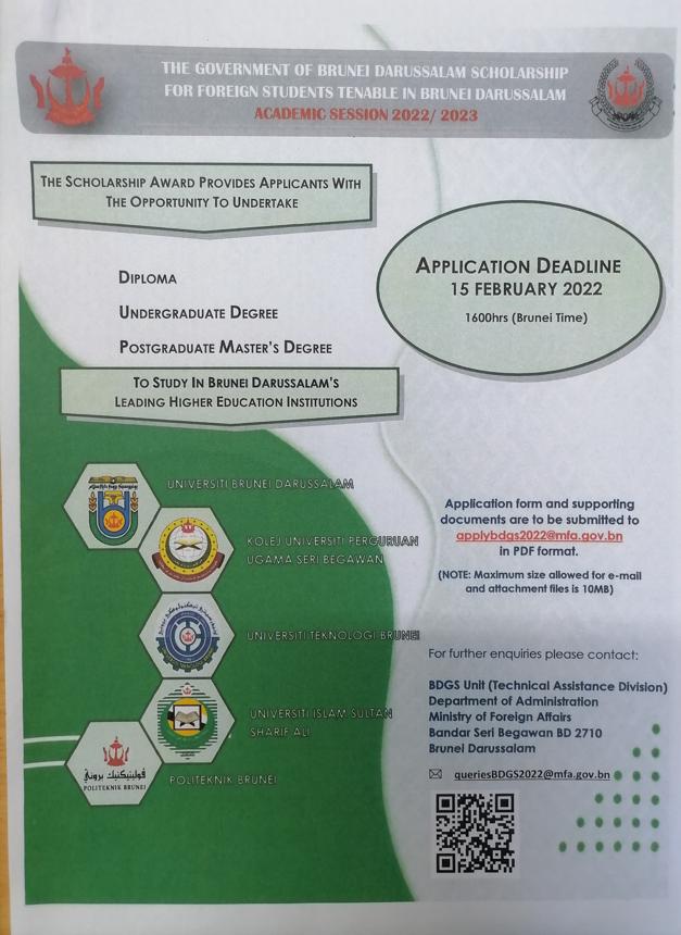 消息稱,2022/2023學年,文萊政府獎學金申請工作現已啟動,有興趣者可參考附件ACADEMIC SESSION 2022/2023并登錄http://www.mfa.gov.bn/Pages/bdgs/bdgs2022.aspx查詢相關信息。