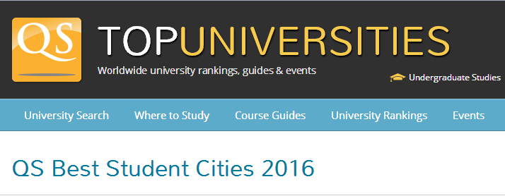“最佳留學城市排名”QS Best Student Cities 2016收集來自全球50個城市的大學生,以大學生眼中的整體和國際視野、令家長放心的安全指數、就業情況、生活費承擔程度,以及畢業生的競爭力作出排名。