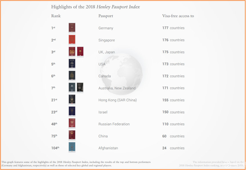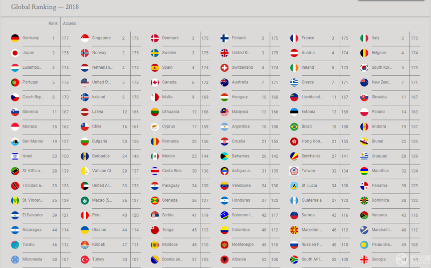 2018年度全球護照最新排行榜1月9日出爐, Henley & Partners咨詢公司根據國際航空運輸協會(IATA)的數據做出的亨氏簽證受限指數(the Henley Passport Index ),揭曉了各國、地區護照排名