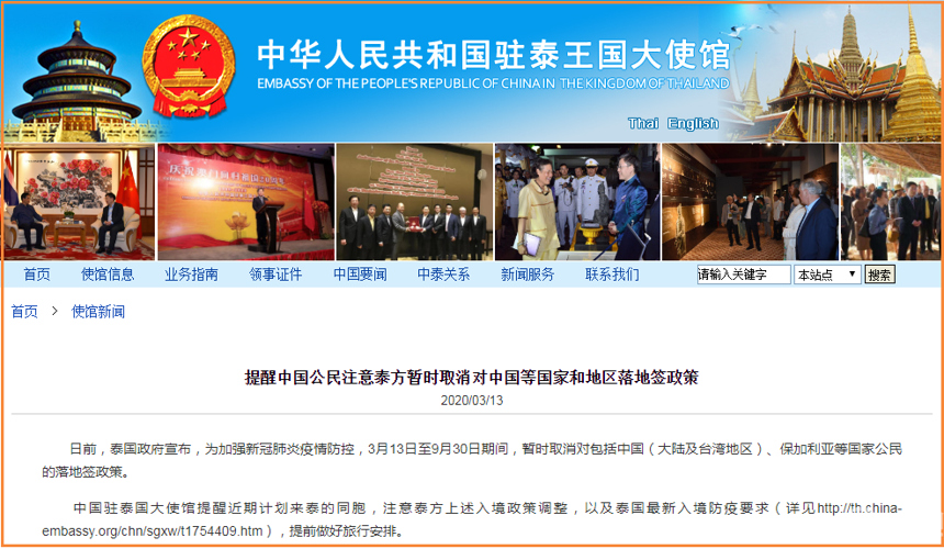 中國駐泰國大使館3月13日發布消息,提醒中國公民注意泰方暫時取消對中國等國家和地區落地簽政策。