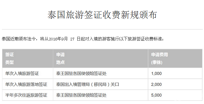 泰國政府宣布,將調漲落地簽申辦費用,從原本的1000泰銖漲為2000泰銖,6個月多次入境則為5000泰銖,并從9月27日起開始實施。