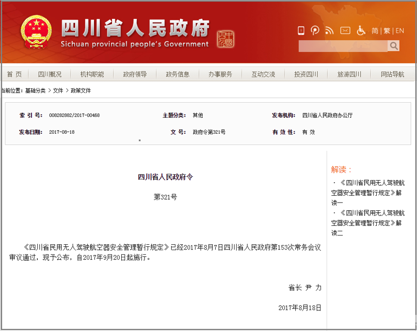 《四川省民用無人駕駛航空器安全管理暫行規定》已經2017年8月7日四川省人民政府第153次常務會議審議通過,自2017年9月20日起施行。