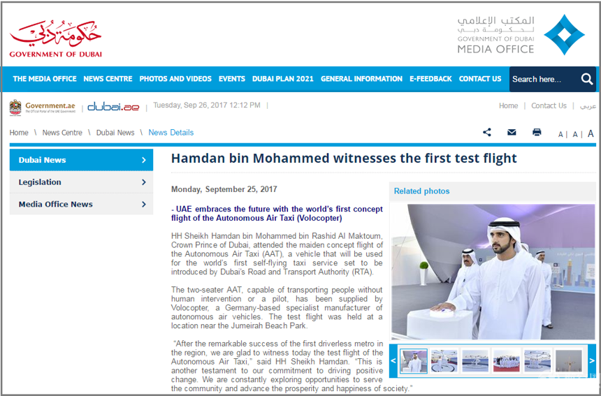 據(jù)迪拜政府媒體辦公室公布的消息,9月25日,領(lǐng)先全球的“自動(dòng)駕駛空中的士”(Autonomous Air Taxi ,AAT),在無載人下試飛成功,未來將推出空中出租車服務(wù),迪拜其將成為世界上第一個(gè)提供無人機(jī)出租車服務(wù)的城市。