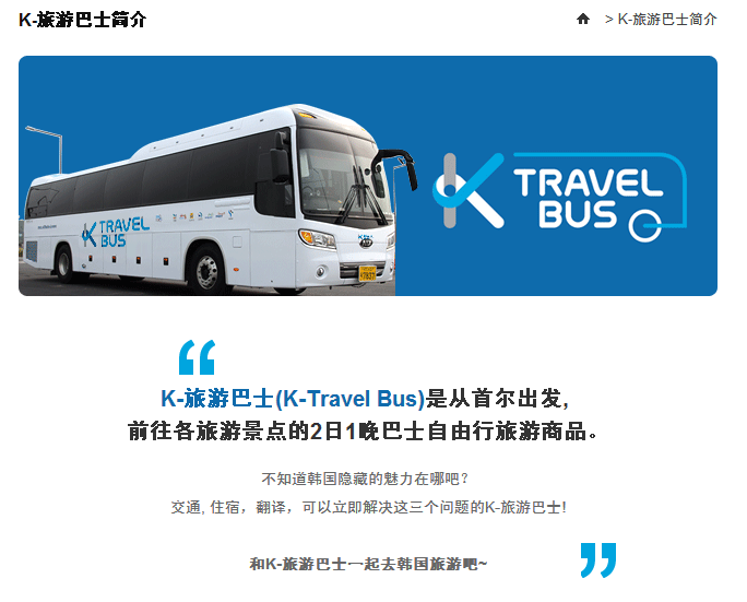 根據K-旅游巴士官網(www.k-travelbus.com)介紹,這個“K-旅游巴士”,可以解決外國游客的交通、住宿和翻譯三個問題,就是從韓國首都首爾到韓國各地旅游景點的2天1晚的巴士自由行旅游產品。今年1月底2月初已經招募了15名外國游客免費體驗。